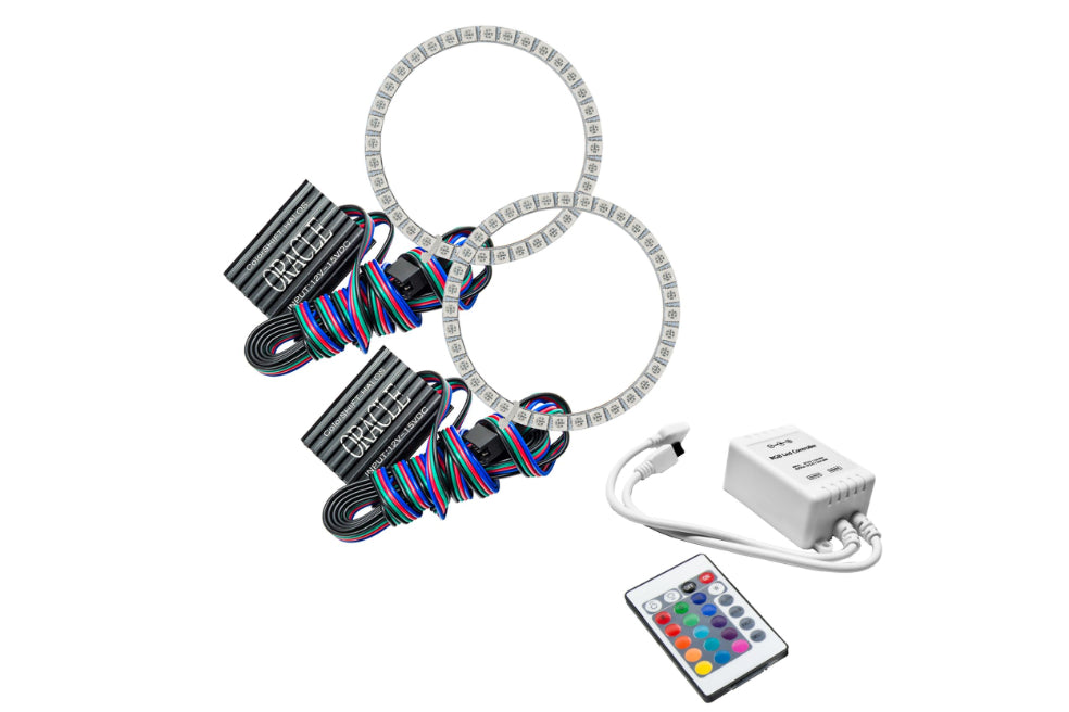 The ColorSHIFT Halo Kit can produce any color including whites from 3000K-15000K with the push of a button. This allows the user to dial-in the exact color rings that they desire. These 3-Chip 5050 SMD rings are BRIGHT, and for some they may be too bright, that is why (for the first time) the user has full control over the ring brightness. ORACLE SMD or "Surface Mount Diode" Halos utilize an advanced type of LED chip that can produce brilliant light output while only consuming a small amount of power. The SMD chips are installed onto a CAD designed 6-layer PCB (Printed Circuit Board) which is very sturdy and will not break if pressured. The PCB can easily be mounted to a headlight housing using the pre-installed 3M adhesive tape backing. ColorSHIFT Halo Kits include the following: ORACLE ColorSHIFT SMD Halos, LED Drivers, Optional ORACLE ColorSHIFT Controller Module, Optional ORACLE ColorSHIFT Wireless Remote, and DIY Installation Instruction Guide.