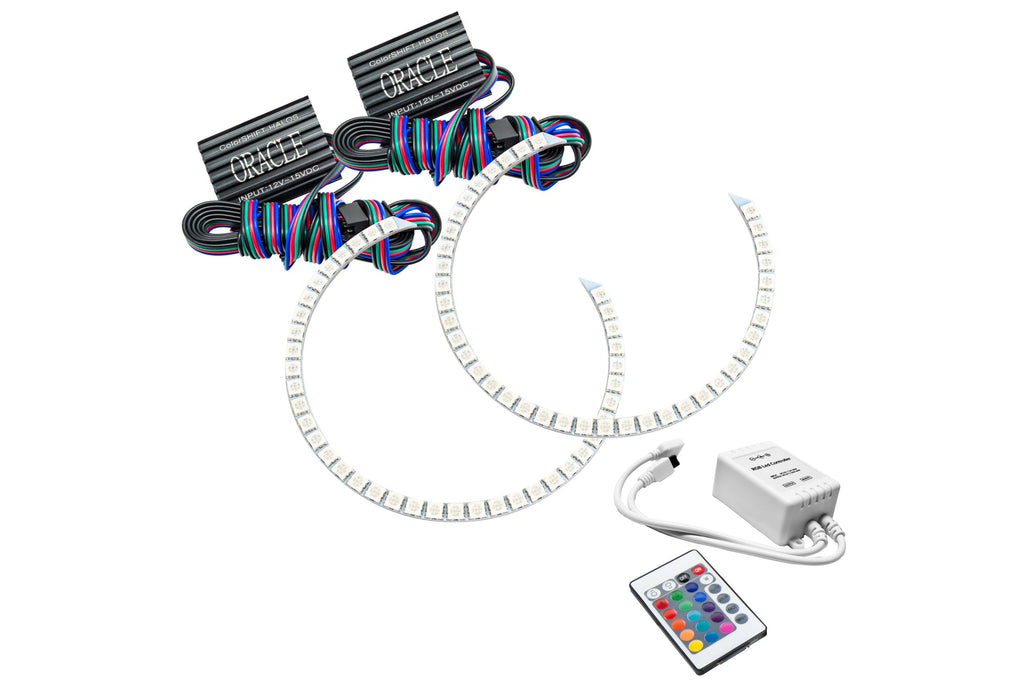 The ColorSHIFT Halo Kit can produce any color including whites from 3000K-15000K with the push of a button. This allows the user to dial-in the exact color rings that they desire. These 3-Chip 5050 SMD rings are BRIGHT, and for some they may be too bright, that is why (for the first time) the user has full control over the ring brightness. ORACLE SMD or "Surface Mount Diode" Halos utilize an advanced type of LED chip that can produce brilliant light output while only consuming a small amount of power. The SMD chips are installed onto a CAD designed 6-layer PCB (Printed Circuit Board) which is very sturdy and will not break if pressured. The PCB can easily be mounted to a headlight housing using the pre-installed 3M adhesive tape backing. ColorSHIFT Halo Kits include the following: ORACLE ColorSHIFT SMD Halos, LED Drivers, Optional ORACLE ColorSHIFT Controller Module, Optional ORACLE ColorSHIFT Wireless Remote, and DIY Installation Instruction Guide.