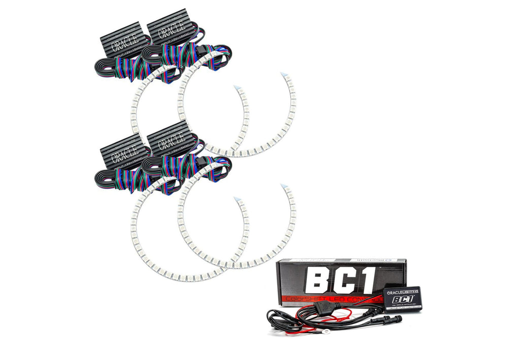 The ColorSHIFT Halo Kit can produce any color including whites from 3000K-15000K with the push of a button. This allows the user to dial-in the exact color rings that they desire. These 3-Chip 5050 SMD rings are BRIGHT, and for some they may be too bright, that is why (for the first time) the user has full control over the ring brightness. ORACLE SMD or "Surface Mount Diode" Halos utilize an advanced type of LED chip that can produce brilliant light output while only consuming a small amount of power. The SMD chips are installed onto a CAD designed 6-layer PCB (Printed Circuit Board) which is very sturdy and will not break if pressured. The PCB can easily be mounted to a headlight housing using the pre-installed 3M adhesive tape backing. The new BC1 ColorSHIFT controller is a robust and rugged Bluetooth option that is easy to install and a low price. Perfect for adding ORACLE ColorSHIFT products to your vehicle, simply connect power and ground then connect your smartphone through the free app to control. The controller features 4 outputs with waterproof connections for easy wiring to your ColorSHIFT lighting products. Through the app you can turn your lights on and off, select from millions of color variations, control patterns, brightness, strobe function, and even control the lights with music