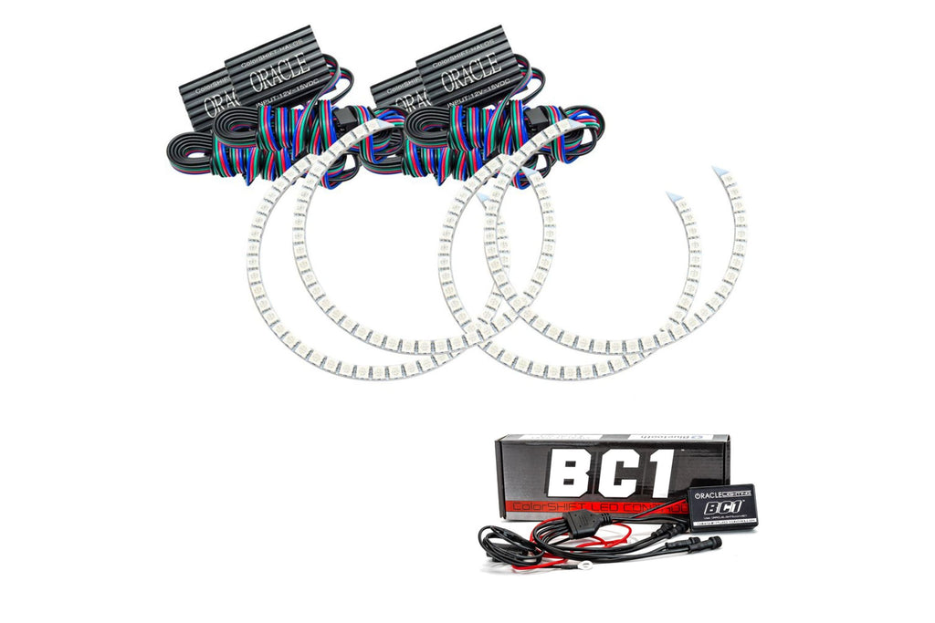 The ColorSHIFT Halo Kit can produce any color including whites from 3000K-15000K with the push of a button. This allows the user to dial-in the exact color rings that they desire. These 3-Chip 5050 SMD rings are BRIGHT, and for some they may be too bright, that is why (for the first time) the user has full control over the ring brightness. ORACLE SMD or "Surface Mount Diode" Halos utilize an advanced type of LED chip that can produce brilliant light output while only consuming a small amount of power. The SMD chips are installed onto a CAD designed 6-layer PCB (Printed Circuit Board) which is very sturdy and will not break if pressured. The PCB can easily be mounted to a headlight housing using the pre-installed 3M adhesive tape backing. The new BC1 ColorSHIFT controller is a robust and rugged Bluetooth option that is easy to install and a low price. Perfect for adding ORACLE ColorSHIFT products to your vehicle, simply connect power and ground then connect your smartphone through the free app to control. The controller features 4 outputs with waterproof connections for easy wiring to your ColorSHIFT lighting products. Through the app you can turn your lights on and off, select from millions of color variations, control patterns, brightness, strobe function, and even control the lights with music