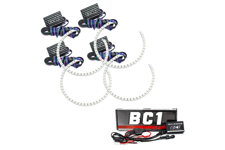 The ColorSHIFT Halo Kit can produce any color including whites from 3000K-15000K with the push of a button. This allows the user to dial-in the exact color rings that they desire. These 3-Chip 5050 SMD rings are BRIGHT, and for some they may be too bright, that is why (for the first time) the user has full control over the ring brightness. ORACLE SMD or "Surface Mount Diode" Halos utilize an advanced type of LED chip that can produce brilliant light output while only consuming a small amount of power. The SMD chips are installed onto a CAD designed 6-layer PCB (Printed Circuit Board) which is very sturdy and will not break if pressured. The PCB can easily be mounted to a headlight housing using the pre-installed 3M adhesive tape backing. The new BC1 ColorSHIFT controller is a robust and rugged Bluetooth option that is easy to install and a low price. Perfect for adding ORACLE ColorSHIFT products to your vehicle, simply connect power and ground then connect your smartphone through the free app to control. The controller features 4 outputs with waterproof connections for easy wiring to your ColorSHIFT lighting products. Through the app you can turn your lights on and off, select from millions of color variations, control patterns, brightness, strobe function, and even control the lights with music