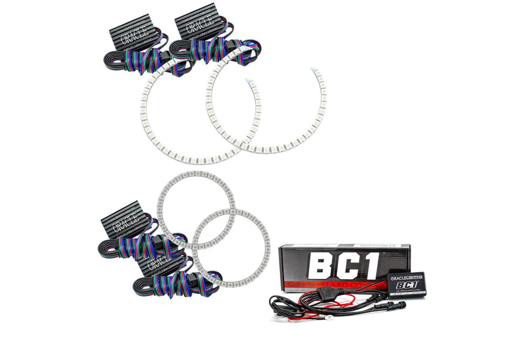 The ColorSHIFT Halo Kit can produce any color including whites from 3000K-15000K with the push of a button. This allows the user to dial-in the exact color rings that they desire. These 3-Chip 5050 SMD rings are BRIGHT, and for some they may be too bright, that is why (for the first time) the user has full control over the ring brightness. ORACLE SMD or "Surface Mount Diode" Halos utilize an advanced type of LED chip that can produce brilliant light output while only consuming a small amount of power. The SMD chips are installed onto a CAD designed 6-layer PCB (Printed Circuit Board) which is very sturdy and will not break if pressured. The PCB can easily be mounted to a headlight housing using the pre-installed 3M adhesive tape backing. The new BC1 ColorSHIFT controller is a robust and rugged Bluetooth option that is easy to install and a low price. Perfect for adding ORACLE ColorSHIFT products to your vehicle, simply connect power and ground then connect your smartphone through the free app to control. The controller features 4 outputs with waterproof connections for easy wiring to your ColorSHIFT lighting products. Through the app you can turn your lights on and off, select from millions of color variations, control patterns, brightness, strobe function, and even control the lights with music
