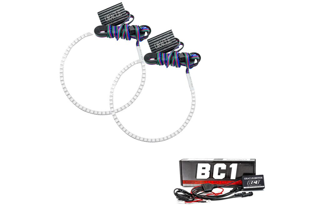 The ColorSHIFT Halo Kit can produce any color including whites from 3000K-15000K with the push of a button. This allows the user to dial-in the exact color rings that they desire. These 3-Chip 5050 SMD rings are BRIGHT, and for some they may be too bright, that is why (for the first time) the user has full control over the ring brightness. ORACLE SMD or "Surface Mount Diode" Halos utilize an advanced type of LED chip that can produce brilliant light output while only consuming a small amount of power. The SMD chips are installed onto a CAD designed 6-layer PCB (Printed Circuit Board) which is very sturdy and will not break if pressured. The PCB can easily be mounted to a headlight housing using the pre-installed 3M adhesive tape backing. The new BC1 ColorSHIFT controller is a robust and rugged Bluetooth option that is easy to install and a low price. Perfect for adding ORACLE ColorSHIFT products to your vehicle, simply connect power and ground then connect your smartphone through the free app to control. The controller features 4 outputs with waterproof connections for easy wiring to your ColorSHIFT lighting products. Through the app you can turn your lights on and off, select from millions of color variations, control patterns, brightness, strobe function, and even control the lights with music