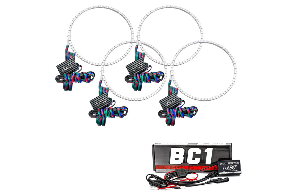The ColorSHIFT Halo Kit can produce any color including whites from 3000K-15000K with the push of a button. This allows the user to dial-in the exact color rings that they desire. These 3-Chip 5050 SMD rings are BRIGHT, and for some they may be too bright, that is why (for the first time) the user has full control over the ring brightness. ORACLE SMD or "Surface Mount Diode" Halos utilize an advanced type of LED chip that can produce brilliant light output while only consuming a small amount of power. The SMD chips are installed onto a CAD designed 6-layer PCB (Printed Circuit Board) which is very sturdy and will not break if pressured. The PCB can easily be mounted to a headlight housing using the pre-installed 3M adhesive tape backing. The new BC1 ColorSHIFT controller is a robust and rugged Bluetooth option that is easy to install and a low price. Perfect for adding ORACLE ColorSHIFT products to your vehicle, simply connect power and ground then connect your smartphone through the free app to control. The controller features 4 outputs with waterproof connections for easy wiring to your ColorSHIFT lighting products. Through the app you can turn your lights on and off, select from millions of color variations, control patterns, brightness, strobe function, and even control the lights with music