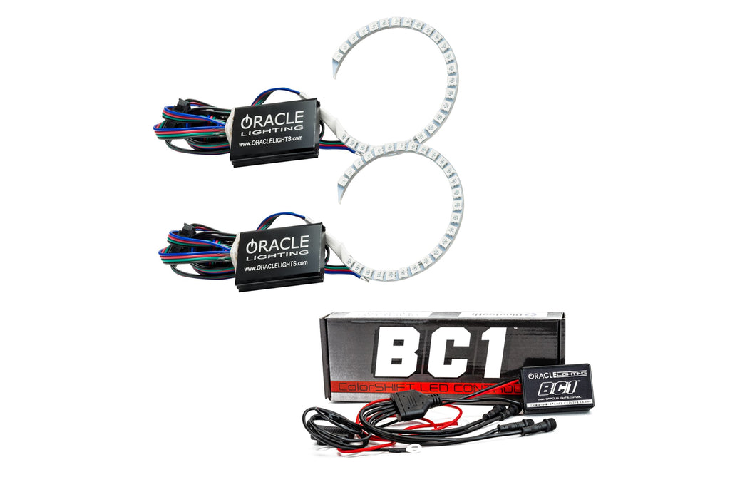 The ColorSHIFT Halo Kit can produce any color including whites from 3000K-15000K with the push of a button. This allows the user to dial-in the exact color rings that they desire. These 3-Chip 5050 SMD rings are BRIGHT, and for some they may be too bright, that is why (for the first time) the user has full control over the ring brightness. ORACLE SMD or "Surface Mount Diode" Halos utilize an advanced type of LED chip that can produce brilliant light output while only consuming a small amount of power. The SMD chips are installed onto a CAD designed 6-layer PCB (Printed Circuit Board) which is very sturdy and will not break if pressured. The PCB can easily be mounted to a headlight housing using the pre-installed 3M adhesive tape backing. The new BC1 ColorSHIFT controller is a robust and rugged Bluetooth option that is easy to install and a low price. Perfect for adding ORACLE ColorSHIFT products to your vehicle, simply connect power and ground then connect your smartphone through the free app to control. The controller features 4 outputs with waterproof connections for easy wiring to your ColorSHIFT lighting products. Through the app you can turn your lights on and off, select from millions of color variations, control patterns, brightness, strobe function, and even control the lights with music