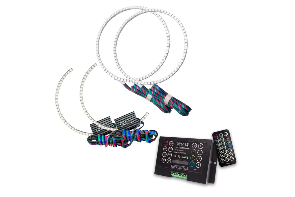 The ColorSHIFT Halo Kit can produce any color including whites from 3000K-15000K with the push of a button. This allows the user to dial-in the exact color rings that they desire. These 3-Chip 5050 SMD rings are BRIGHT, and for some they may be too bright, that is why (for the first time) the user has full control over the ring brightness. ORACLE SMD or "Surface Mount Diode" Halos utilize an advanced type of LED chip that can produce brilliant light output while only consuming a small amount of power. The SMD chips are installed onto a CAD designed 6-layer PCB (Printed Circuit Board) which is very sturdy and will not break if pressured. The PCB can easily be mounted to a headlight housing using the pre-installed 3M adhesive tape backing. ColorSHIFT Halo Kits include the following: ORACLE ColorSHIFT SMD Halos, LED Drivers, Optional ORACLE ColorSHIFT Controller Module, Optional ORACLE ColorSHIFT Wireless Remote, and DIY Installation Instruction Guide.