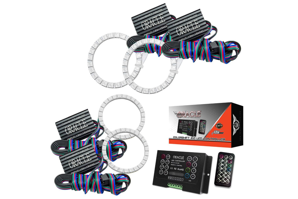 The ColorSHIFT Halo Kit can produce any color including whites from 3000K-15000K with the push of a button. This allows the user to dial-in the exact color rings that they desire. These 3-Chip 5050 SMD rings are BRIGHT, and for some they may be too bright, that is why (for the first time) the user has full control over the ring brightness. ORACLE SMD or "Surface Mount Diode" Halos utilize an advanced type of LED chip that can produce brilliant light output while only consuming a small amount of power. The SMD chips are installed onto a CAD designed 6-layer PCB (Printed Circuit Board) which is very sturdy and will not break if pressured. The PCB can easily be mounted to a headlight housing using the pre-installed 3M adhesive tape backing. ColorSHIFT Halo Kits include the following: ORACLE ColorSHIFT SMD Halos, LED Drivers, Optional ORACLE ColorSHIFT Controller Module, Optional ORACLE ColorSHIFT Wireless Remote, and DIY Installation Instruction Guide.