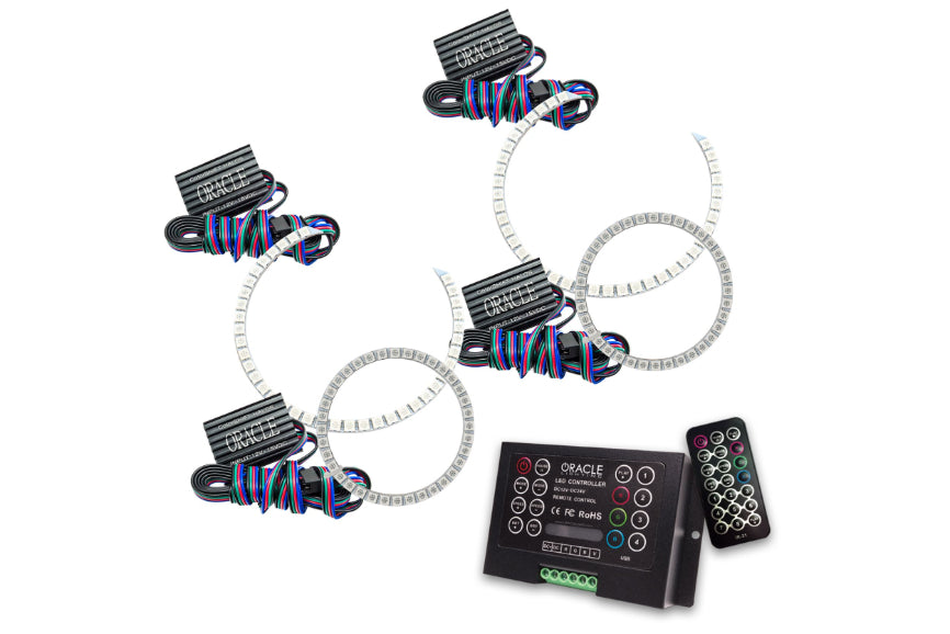 The ColorSHIFT Halo Kit can produce any color including whites from 3000K-15000K with the push of a button. This allows the user to dial-in the exact color rings that they desire. These 3-Chip 5050 SMD rings are BRIGHT, and for some they may be too bright, that is why (for the first time) the user has full control over the ring brightness. ORACLE SMD or "Surface Mount Diode" Halos utilize an advanced type of LED chip that can produce brilliant light output while only consuming a small amount of power. The SMD chips are installed onto a CAD designed 6-layer PCB (Printed Circuit Board) which is very sturdy and will not break if pressured. The PCB can easily be mounted to a headlight housing using the pre-installed 3M adhesive tape backing. ColorSHIFT Halo Kits include the following: ORACLE ColorSHIFT SMD Halos, LED Drivers, Optional ORACLE ColorSHIFT Controller Module, Optional ORACLE ColorSHIFT Wireless Remote, and DIY Installation Instruction Guide.