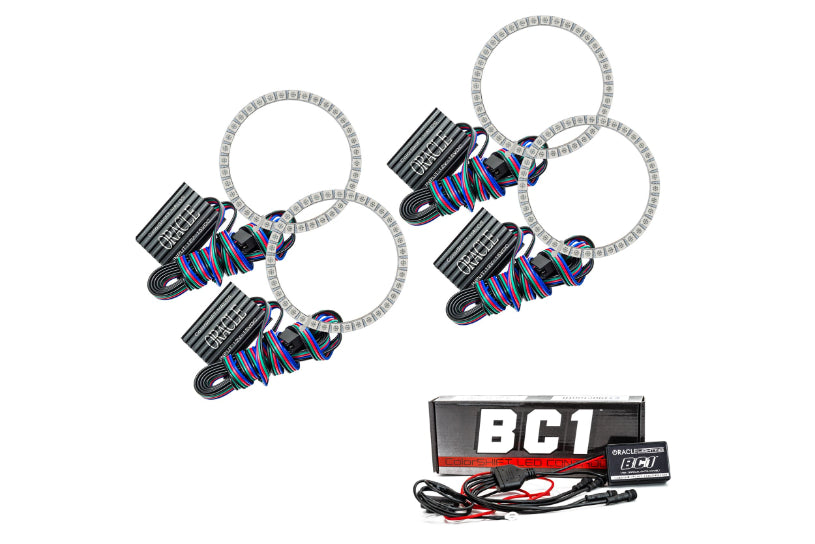 The ColorSHIFT Halo Kit can produce any color including whites from 3000K-15000K with the push of a button. This allows the user to dial-in the exact color rings that they desire. These 3-Chip 5050 SMD rings are BRIGHT, and for some they may be too bright, that is why (for the first time) the user has full control over the ring brightness. ORACLE SMD or "Surface Mount Diode" Halos utilize an advanced type of LED chip that can produce brilliant light output while only consuming a small amount of power. The SMD chips are installed onto a CAD designed 6-layer PCB (Printed Circuit Board) which is very sturdy and will not break if pressured. The PCB can easily be mounted to a headlight housing using the pre-installed 3M adhesive tape backing. The new BC1 ColorSHIFT controller is a robust and rugged Bluetooth option that is easy to install and a low price. Perfect for adding ORACLE ColorSHIFT products to your vehicle, simply connect power and ground then connect your smartphone through the free app to control. The controller features 4 outputs with waterproof connections for easy wiring to your ColorSHIFT lighting products. Through the app you can turn your lights on and off, select from millions of color variations, control patterns, brightness, strobe function, and even control the lights with music