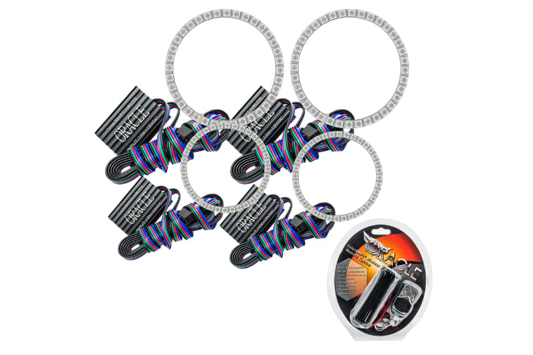 The ColorSHIFT Halo Kit can produce any color including whites from 3000K-15000K with the push of a button. This allows the user to dial-in the exact color rings that they desire. These 3-Chip 5050 SMD rings are BRIGHT, and for some they may be too bright, that is why (for the first time) the user has full control over the ring brightness. ORACLE SMD or "Surface Mount Diode" Halos utilize an advanced type of LED chip that can produce brilliant light output while only consuming a small amount of power. The SMD chips are installed onto a CAD designed 6-layer PCB (Printed Circuit Board) which is very sturdy and will not break if pressured. The PCB can easily be mounted to a headlight housing using the pre-installed 3M adhesive tape backing. ColorSHIFT Halo Kits include the following: ORACLE ColorSHIFT SMD Halos, LED Drivers, Optional ORACLE ColorSHIFT Controller Module, Optional ORACLE ColorSHIFT Wireless Remote, and DIY Installation Instruction Guide.