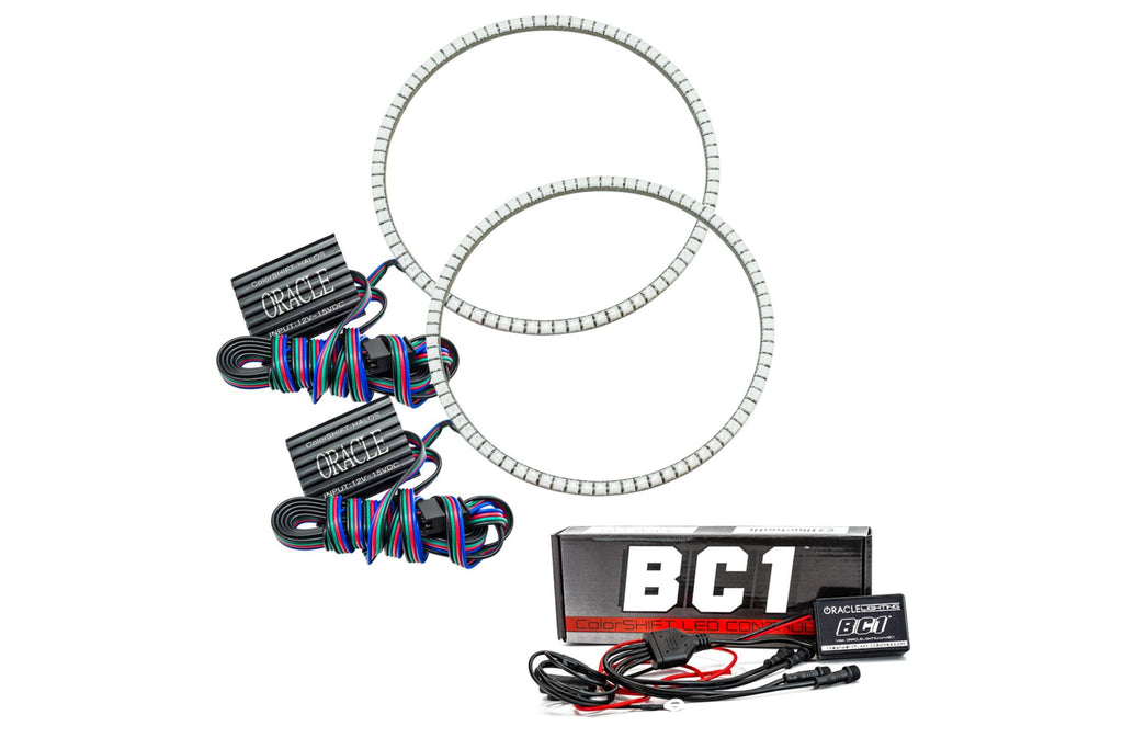 The ColorSHIFT Halo Kit can produce any color including whites from 3000K-15000K with the push of a button. This allows the user to dial-in the exact color rings that they desire. These 3-Chip 5050 SMD rings are BRIGHT, and for some they may be too bright, that is why (for the first time) the user has full control over the ring brightness. ORACLE SMD or "Surface Mount Diode" Halos utilize an advanced type of LED chip that can produce brilliant light output while only consuming a small amount of power. The SMD chips are installed onto a CAD designed 6-layer PCB (Printed Circuit Board) which is very sturdy and will not break if pressured. The PCB can easily be mounted to a headlight housing using the pre-installed 3M adhesive tape backing. The new BC1 ColorSHIFT controller is a robust and rugged Bluetooth option that is easy to install and a low price. Perfect for adding ORACLE ColorSHIFT products to your vehicle, simply connect power and ground then connect your smartphone through the free app to control. The controller features 4 outputs with waterproof connections for easy wiring to your ColorSHIFT lighting products. Through the app you can turn your lights on and off, select from millions of color variations, control patterns, brightness, strobe function, and even control the lights with music