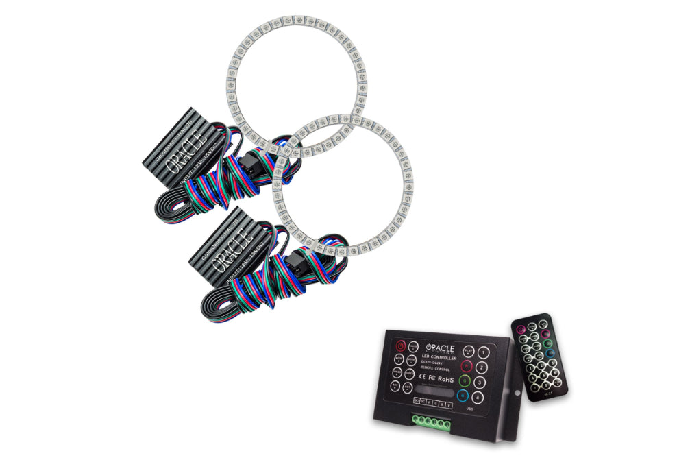 The ColorSHIFT Halo Kit can produce any color including whites from 3000K-15000K with the push of a button. This allows the user to dial-in the exact color rings that they desire. These 3-Chip 5050 SMD rings are BRIGHT, and for some they may be too bright, that is why (for the first time) the user has full control over the ring brightness. ORACLE SMD or "Surface Mount Diode" Halos utilize an advanced type of LED chip that can produce brilliant light output while only consuming a small amount of power. The SMD chips are installed onto a CAD designed 6-layer PCB (Printed Circuit Board) which is very sturdy and will not break if pressured. The PCB can easily be mounted to a headlight housing using the pre-installed 3M adhesive tape backing. ColorSHIFT Halo Kits include the following: ORACLE ColorSHIFT SMD Halos, LED Drivers, Optional ORACLE ColorSHIFT Controller Module, Optional ORACLE ColorSHIFT Wireless Remote, and DIY Installation Instruction Guide.