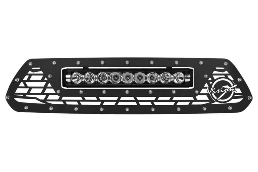 LED Grille Light Kit: This custom line of Vision X grilles was made for us from our friends over at Royalty Core. These grilles have a satin black power coat over a rugged stainless steel frame. Optional CG2 4.7inLIGHT CANNONS: The CG2 Light Cannons is Vision X's latest and greatest of the Light Cannon series. This configuration combines the distance of the big chip single source CG2 Cannon with the massive light output of the multi-LED version. The pairing of these two lights creates an unheard of amount of brightness and distance ideal for any situation. Optional XPR-9M LIGHT BAR: Utilizing top-binned 10-Watt LEDs and large proprietary 1.5indiameter IRIS Reflectors, the XPR-9M Light Bar is capable of reaching a staggering 1,365 feet of usable light. This unmatched long-distance projection is also accompanied by precisely tilted IRIS Reflectors that create a unique combination beam pattern to provide even more visibility at the road's edge.